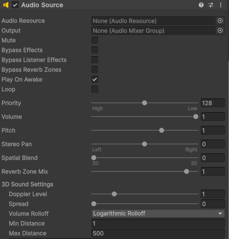 Volume Rolloff | 距離による音量減衰カーブを選択(Logarithmic / Linear / Custom) | 3D音の減衰方法を制御 |