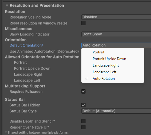場所としては「Edit」→「Project Settings」→「Player」→「Resolution and Presentation」→「Orientaion」→「Defalut Orientation」にあります。