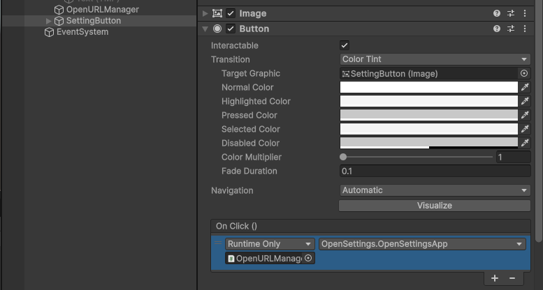 作成が終わると空のGameObjectを作成し、スクリプトをアタッチします。次にButtonを用意してOnClickに「OpenSettingsApp」を呼び出すように設定しておきます。